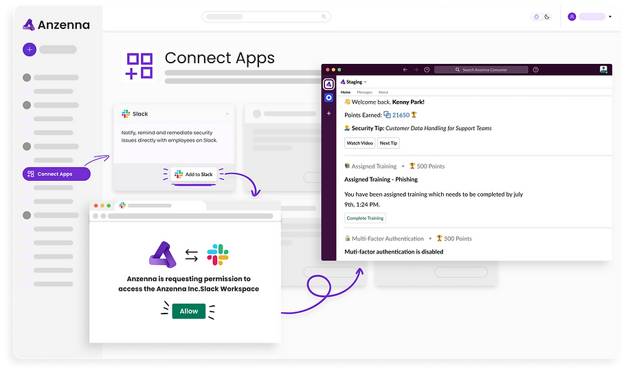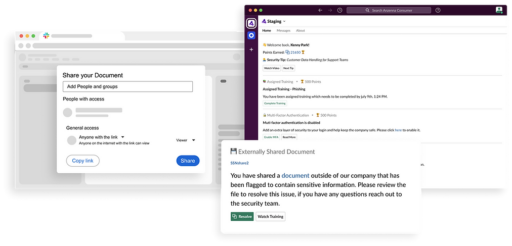 Engage your employees on security issues and training in Slack. The Anzenna app is a trust center personalized for every employee right inside Slack. Employees get notified when they have security action items. Examples include Training modules and contextual security alerts based on their actions . There is also built-in easy remediation and incentive points to encourage employees to participate.